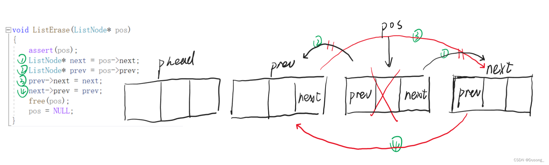 2.举一反三:定义prev,用它找到pos的前一位并用prev指向它,此时用next将prev与pos的下一位(pos->next)链接起来就能将pos指向的位置给丢掉啦!(别玩了用free掉pos,将他丢干净😎)