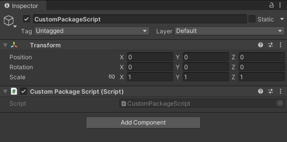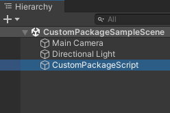 }작성한 스크립트를 [Samples] → [CustomPackageScene] 씬에서 빈 오브젝트를 만들어 컴포넌트화 해줍니다.
