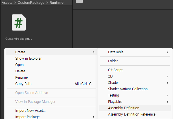 Runtime 폴더와 Editor 폴더 내부에 각각 asemdef 파일을 생성해줍니다.