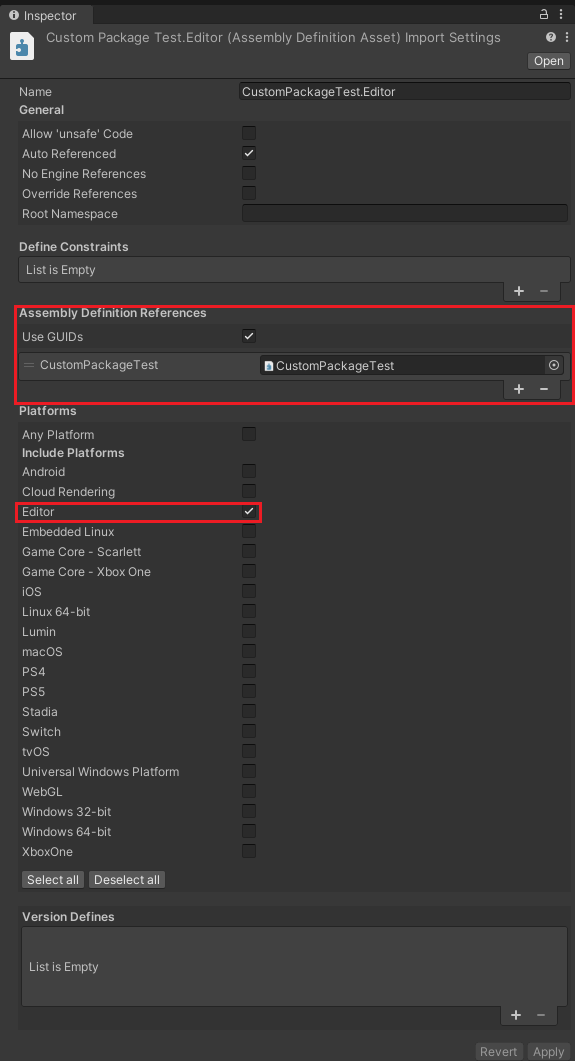 Runtime 폴더의 asemdef 파일은 초기 상태 그대로 두고, Editor 폴더의 asemdef 파일은 아래와 같이 구성해줍니다.