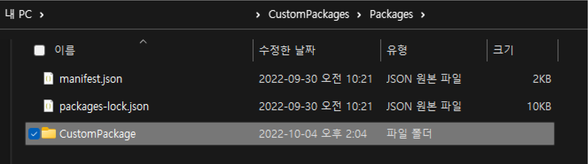 패키지에 사용 할 파일들을 폴더째로 [Project] → [Packages] 폴더 내부로 이동해줍니다.