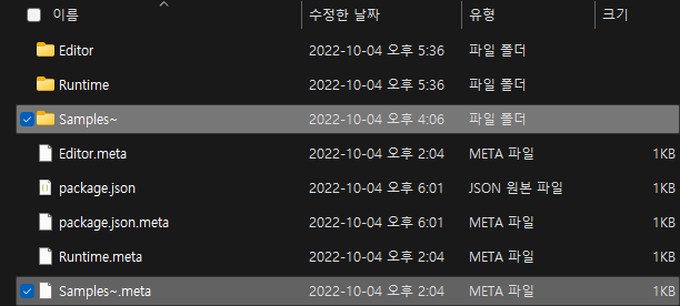 Samples폴더와 Samples.meta 파일의 이름을 package.json에 작성한 것과 같이 변경해줍니다.