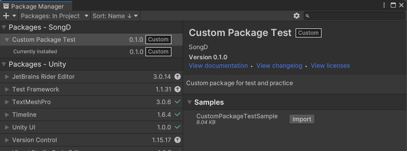 에디터로 돌아와 [Window] → [Package Manager] 에서 지금까지 만든 패키지를 확인 할 수 있습니다.