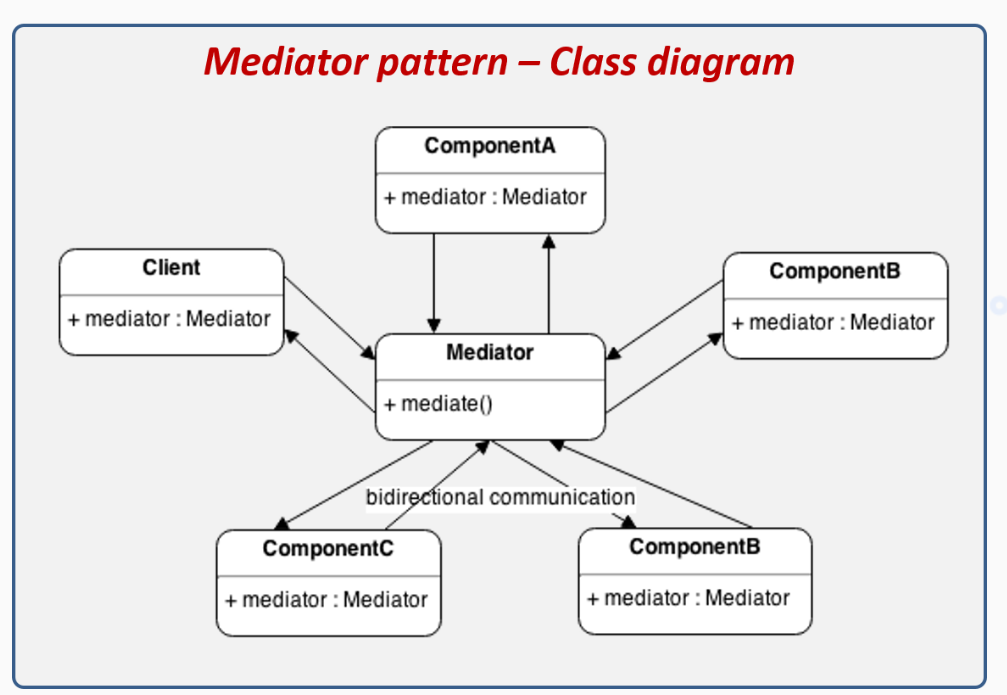 Define un objeto que encapsula la forma en la que múltiples objetos interactúan. El Mediador promueve bajo acoplamiento protegiendo la referenciación explícita de los objetos entre sí, permitiendo que puedas variar esta interacción de manera independiente.