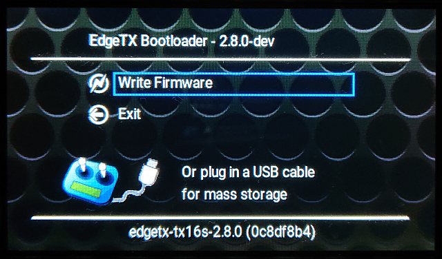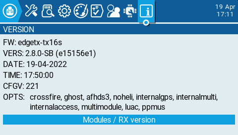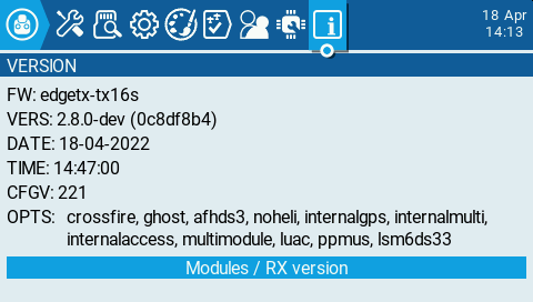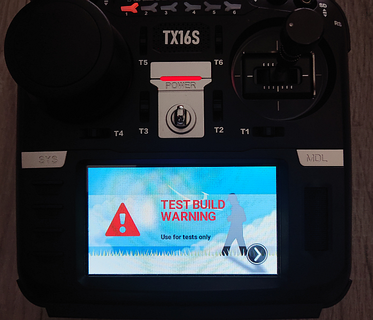 Please double check if I got this right: Lines 51 to 59 in e15156e The result on radio with present state for GitHub built firmware (do not like "merge" string though so much, would prefer "dev" instead): The output of the same source code locally built w/o specifying Also, a test build warning screen is shown now on power-up, although at the moment only for self-built versions where EDGETX_VERSION_SUFFIX is not defined: Ideally, this could be shown for all non-release versions. |