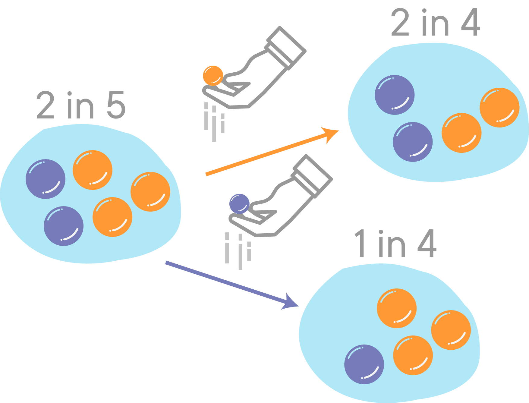 $\dfrac{2}{4}$ . - If we saw a purple marble first, however, the probability of seeing a purple in the second trial is