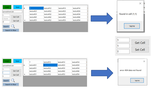 The load button loads the data from the "spreadsheet.dat" which is given in the File text box below it (absolute path or relative path) into the dataGridView. An incorrect path will show an error MessageBox.