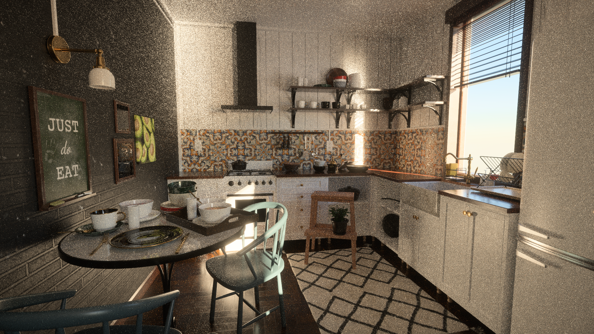 While it might be possible to improve on this with better spatiotemporal reservoir exchange, this is starting to reach a limit of what ReSTIR can do with reasonable quality. A path traced version of this scene at one path per pixel looks like this: