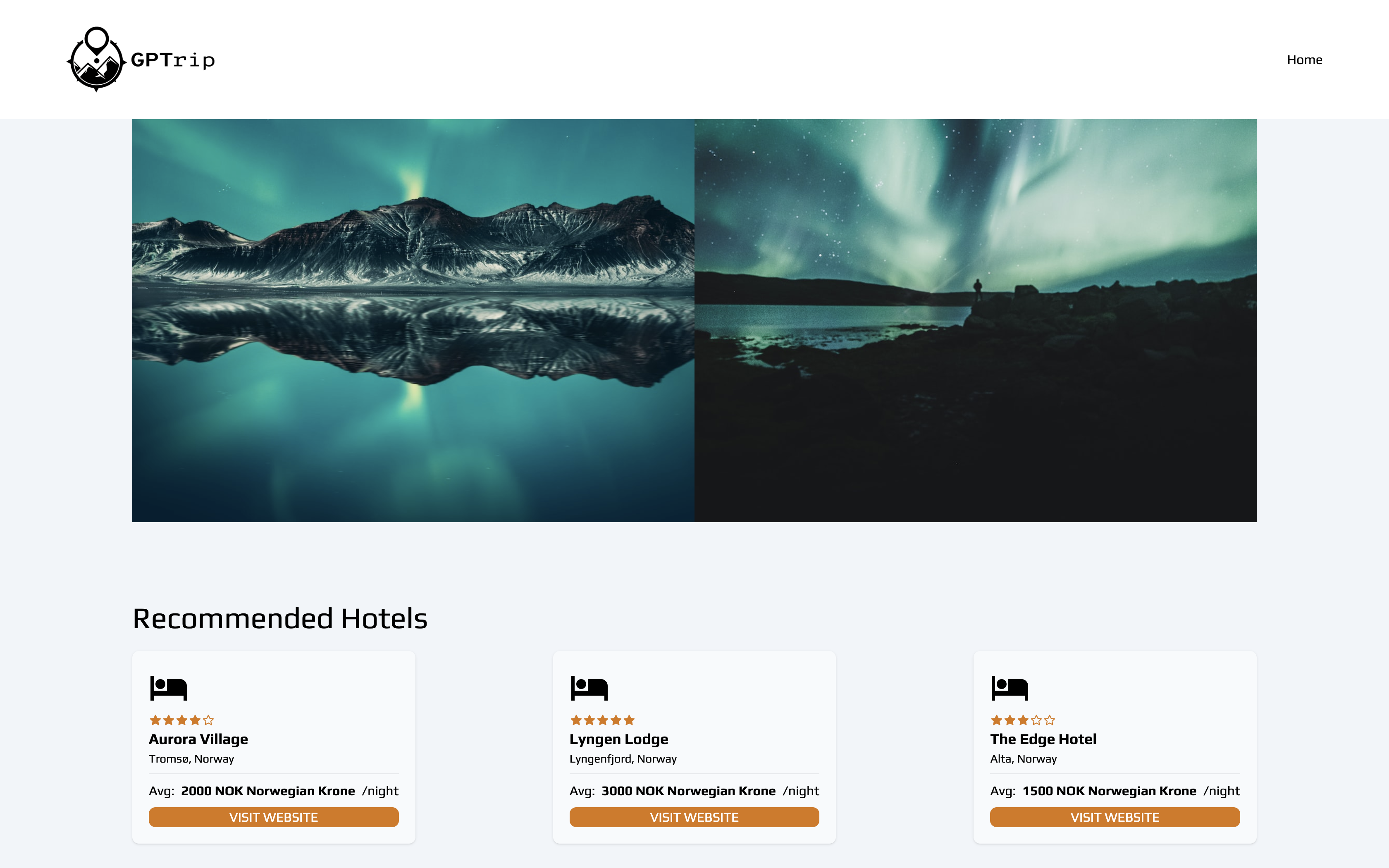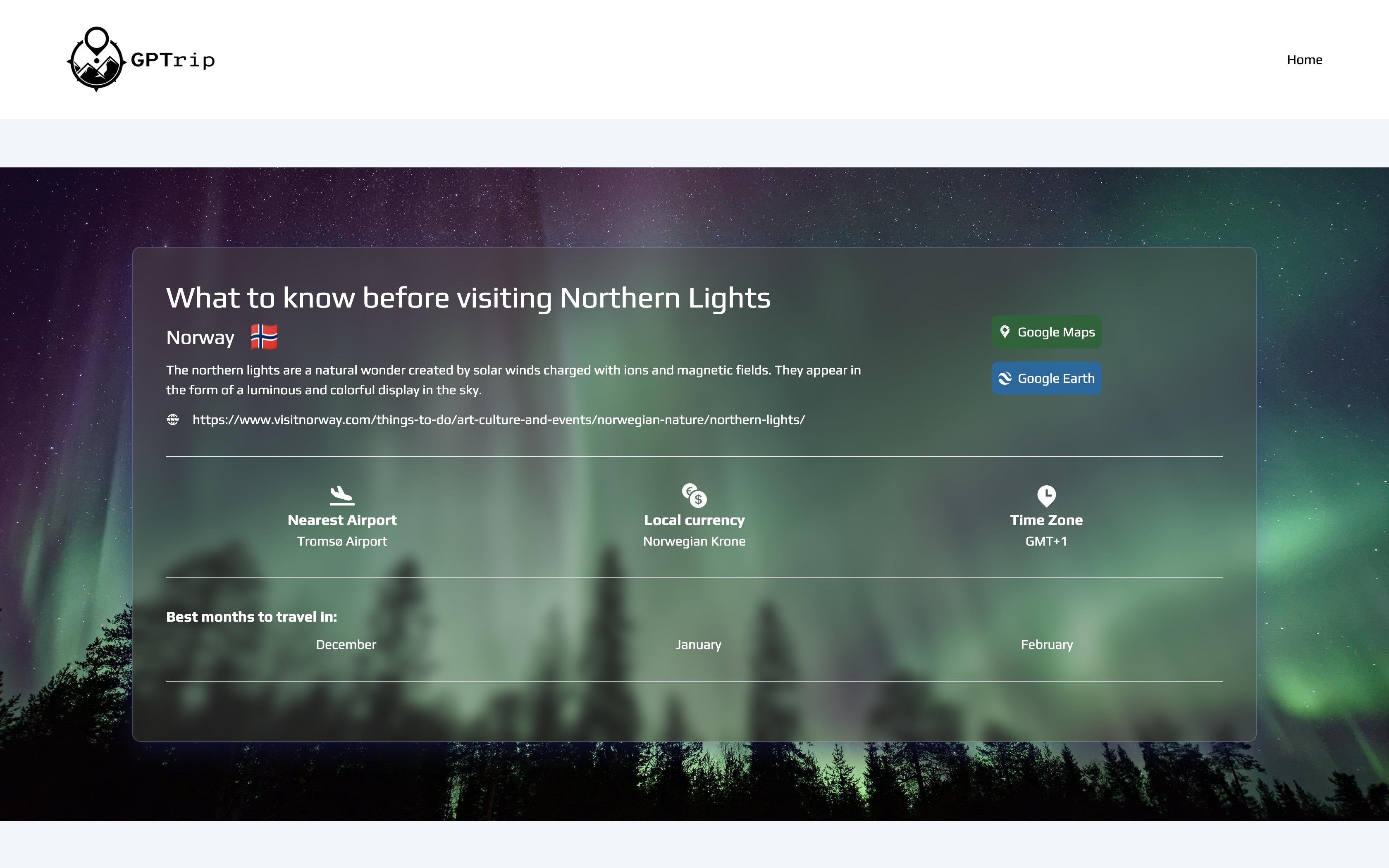 GPTrip is a travel planning web application that uses OpenAI's natural language processing capabilities to generate personalized travel recommendations based on user preferences. Built using React, Node.js, and Express, GPTrip asks users a series of questions about their travel preferences, including destination, dates, and activities they're interested in. This information is then passed to the OpenAI API, which generates a recommendation based on the user's responses.