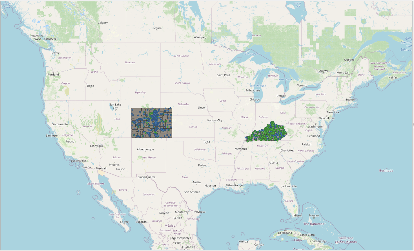 With my boundaries present, I could utilise SQL queries to remove everything outside the cities of Denver and Kentucky. This gave me a better picture of school, fast food and park locations on the map. I overlay these data points onto a map of the U.S.A above. Not only does this make for a good visual demonstration, it also allows me to confirm whether the geographic coordinates of points are correctly stored. i.e locations that should be located in the areas of interest are not scattered elsewhere. If points like that were to be found, I would have to either correct their location or delete the data point because it would not allow for accurate analysis.