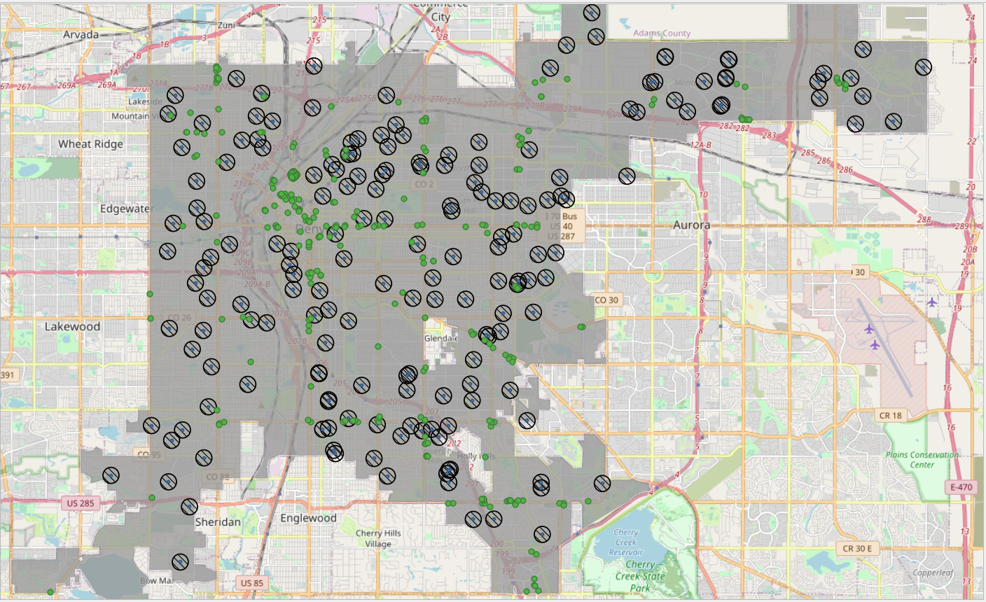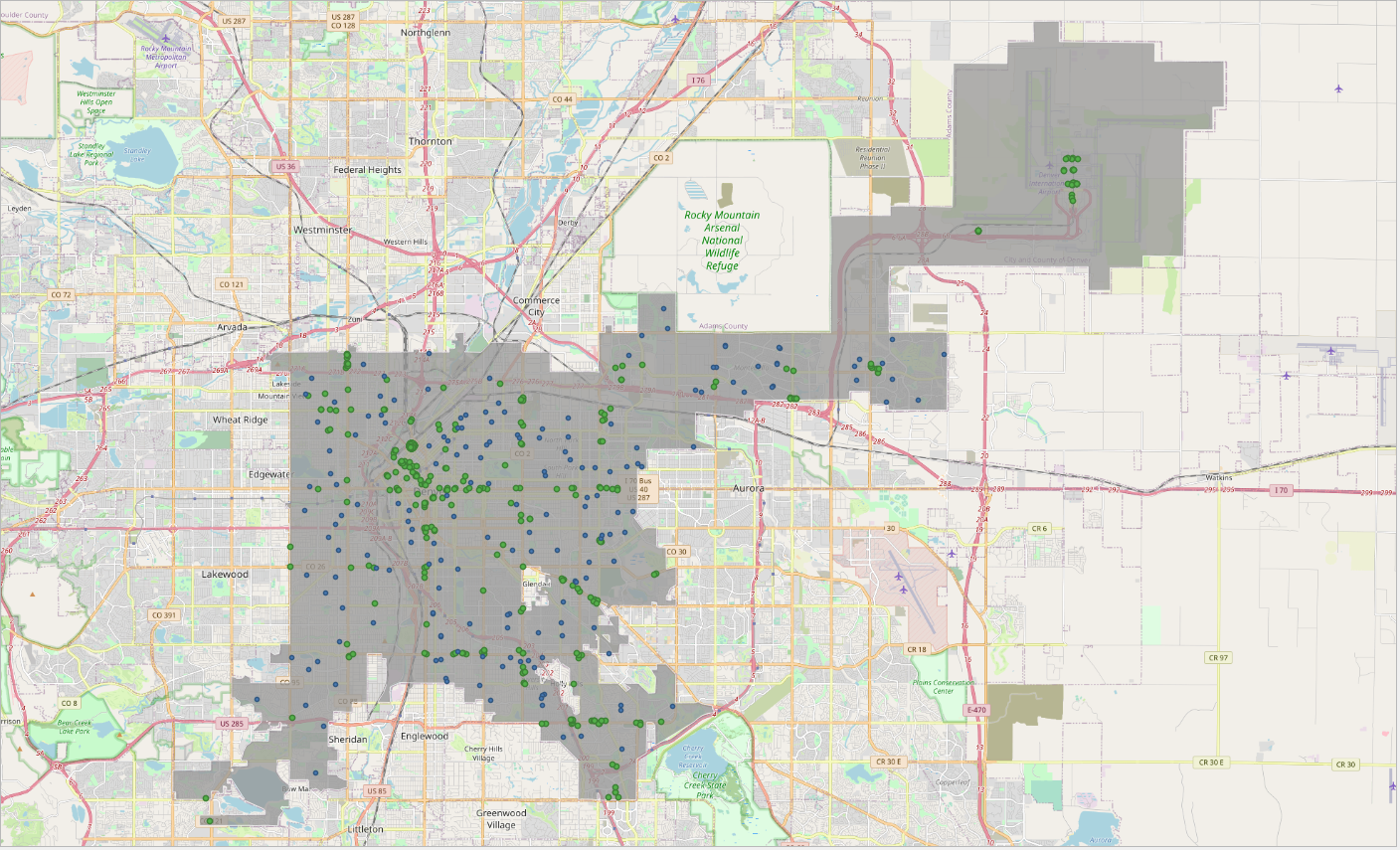 Below, you can see the city of Denver with boundary lines, school location (in blue) and fast food locations (in green).