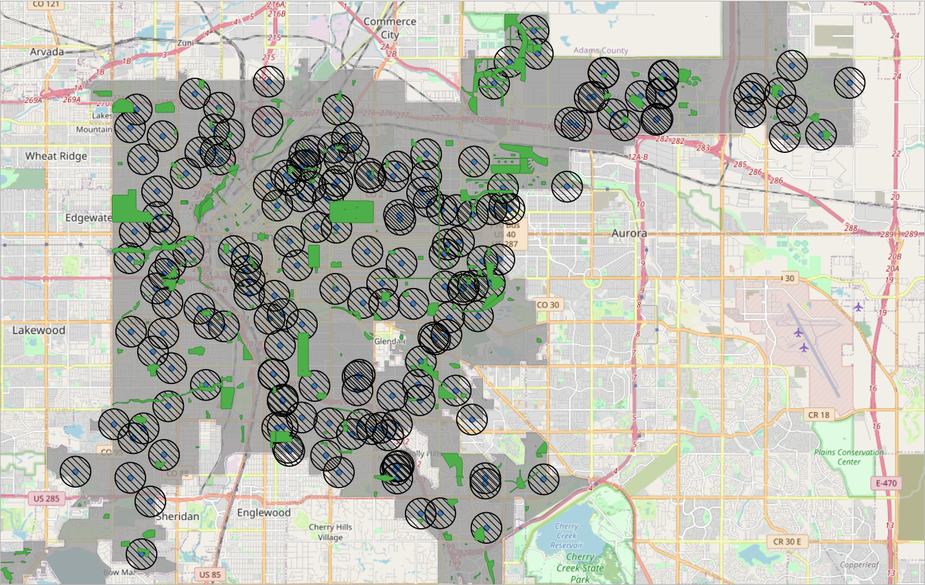 Above I show the 500m buffer around schools in Denver shaded. The locations of schools in green are visible and through SQL queries I can get a count of how many schools have a green point located within the buffer. The same analysis is carried out for 1000m buffers and parks.