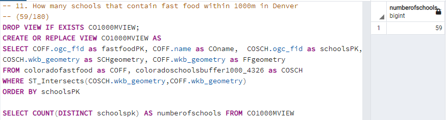 I utilised the ST_Intersects function within SQL to filter out which fast food places are located within my 1000m buffer zone and then displayed this using SELECT COUNT to display the number on the right.