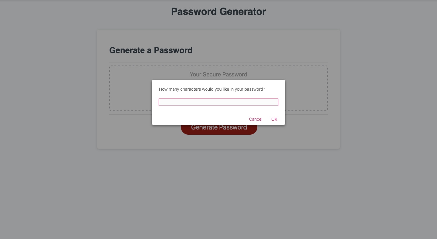 When the the "Generate Password" button is clicked, character lenght is chosen and met, and criterias are seleted, it generates a password.