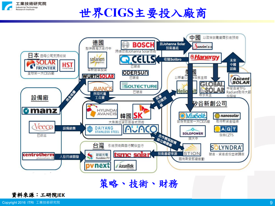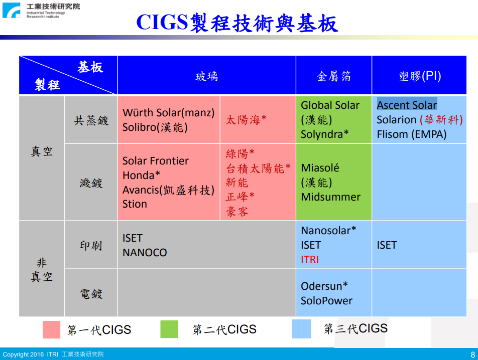 - Global Solar Energy 铜铟镓硒柔性薄膜(共蒸法) 研发转换效率18.7%,量产转换效率16.3%