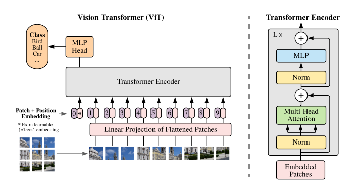 Aşağıdaki görselde mimarinin tamamı gösterilmektedir. Genel anlamda özetlersek ilk olarak görüntü alınarak patch'lere ayrılır. Elde edilen patch'ler vektörlere çevrilerek bir dizi elde edilir ve bu dizinin en başına öğrenilebilir bir parametre olan classification token eklenir. Encoder'a girdi olarak verilmeden önce bu diziye bir de konum bilgisi (positional encoding) eklenir. Bu aşamalardan sonra artık girdi Encoder'a verilmek için uygun hale getirilmiş olur ve dizi Transformer Encoder'a girer. Transformer Encoder içerisinde MSA(Multi-Head Self Attention) ve MLP(Multi Layer Perceptron) olmak üzere 2 temel kısım bulunur. MSA kısmında attention skorları elde edilir. MLP kısmında da classification token ile sınıflandırma işlemi gerçekleştirilir.