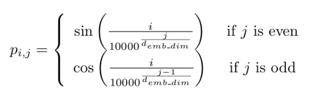 Positional encoding ile elde edilen bu patch embedding dizisine konum bilgisi eklenir. Transformer yapıları girdilerin sırasını hatırlama yeteneğine sahip değildir. Bu nedenle görüntüdeki patch'lerin sırasının değişmesi demek görüntünün anlamının kaybolması demektir. Bundan dolayı positional encoding'e ihtiyaç duyarız. Positional encoding için kullanılan formüller aşağıdaki görselde verilmiştir. O satırdaki indis çift ise sin fonskiyonu tek ise cos fonskiyonu kullanılmaktadır.
