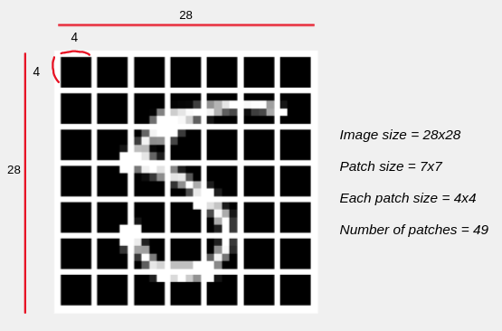 Bu kısımda görüntü belli bir patch (parça) sayısına göre parçalara ayrılır. NxNxC'lik bir görüntü için patch boyutunu PxP olarak belirlediğimizde elde edilen toplam patch sayısı (H*W*C)/(P*P) olur. Örneğin elimizde 28x28x1 boyutunda bir görsel olsun. Eğer patch boyutunu 7x7 olarak belirlersek elde edeceğimiz toplam patch sayısı 16 olur ve oluşan her bir patch'in boyutu da 4x4x1 olur. Daha iyi anlamak için aşağıdaki şekildeki görselleştirmeye bakılabilir. Ayrıca patch'lere ayırma ve görselleştirme için patchifying.ipynb kodu da incelenebilir.
