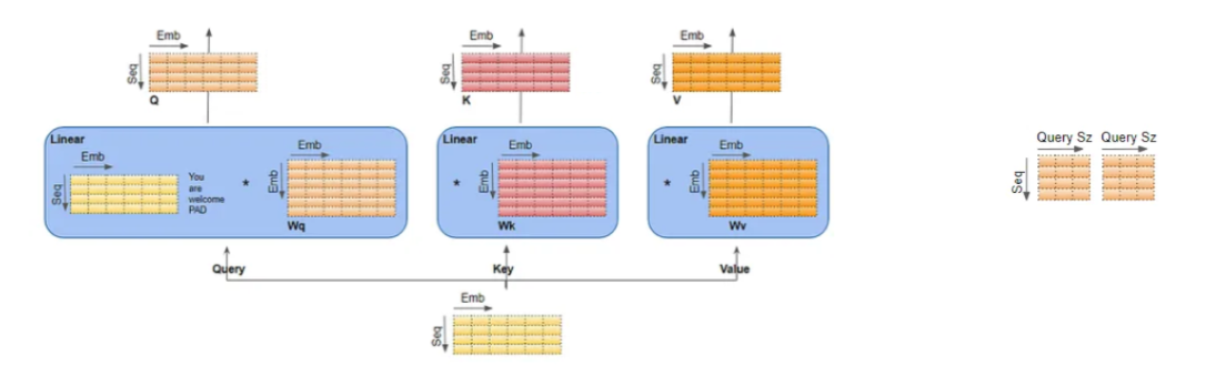 Transformer mimarisinin en önemli kısmı diyebiliriz. Bu kısımda kolaylık olması açısından sadece tek bir görüntü üzerinden ilerlenmektedir. Elimizdeki (seq, emb_size) şeklinde bir matrisimiz mevcut. Bu aşamada Query(Q), Key(K) ve Value(V) matrislerimizi oluşturmak için öncelikle (seq, emb_size) matrisimiz her birinin ağırlıkları birbirinden farklı olan Wq, Wk ve Wv matrisleri ile çarpılır. Bu çarpım sonucunda Q, K ve V matrislerimizi elde ederiz (aşağıdaki görselde sol taraf). Bu kısımda aslında bahsetmemiz gereken bir diğer kavram da head kavramıdır. Bu elde ettiğimiz Q, K ve V matrislerinin her biri sonraki işlemler için head'lere ayrılırlar. Q matrisi için şekildeki sağ taraftaki kısmı inceleyelim. Head sayısı 2 ise eğer artık emb_size kısmı her bir head için emb_size/n_head ile 3 olacaktır. Bizim kendi kodumuzda emb_size değeri 8 ve n_heads değeri 2 olarak belirlendiğinden elde edilen değer 4 olmaktadır. Sonrasında bu matrislerden Q ile K matrisi dot product yapılarak head sayısının kareköküne bölünür. Ardından ise elde edilen matris softmax fonskiyonundan geçirilir ve V matrisi ile çarpılır. Bu işlem sonucunda aslında bir head için attention score elde etmiş olunur. Bu attention score'lar ise en sonda birleştirilerek tek bir matris haline getirilirler.