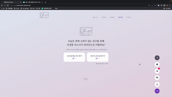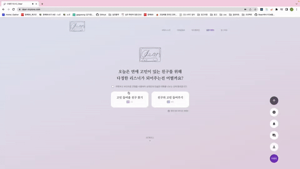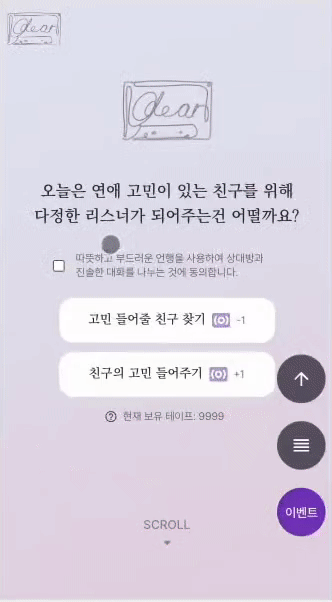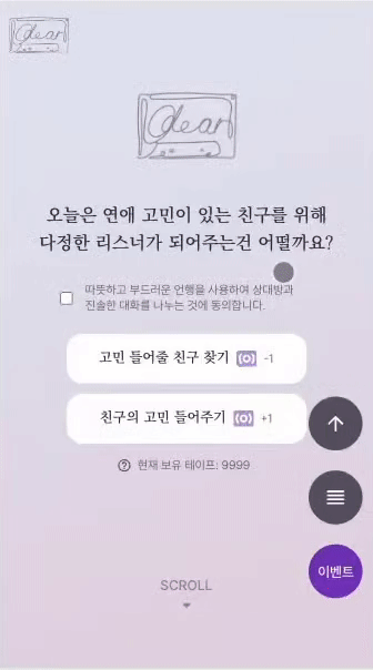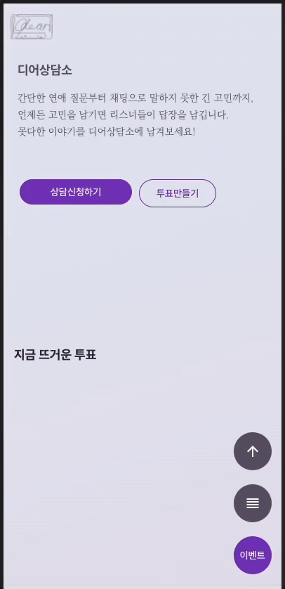 - 대화가 부담스러운 날에는 디어 상담소에서 사람들과 소통해요! 간단한 질문은 투표로 남겨보세요!