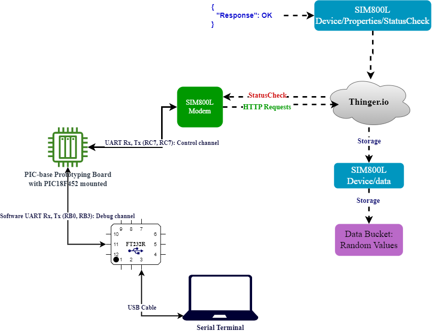 This repository includes a demo Data Logger application (by implementing a lightweight REST API Client), that illustrate the usage of the SIM800x API, with a SIM800L modem and a PIC18F452. Following is a simplified diagram of it's operation.