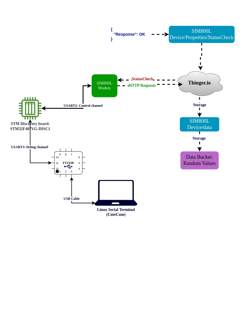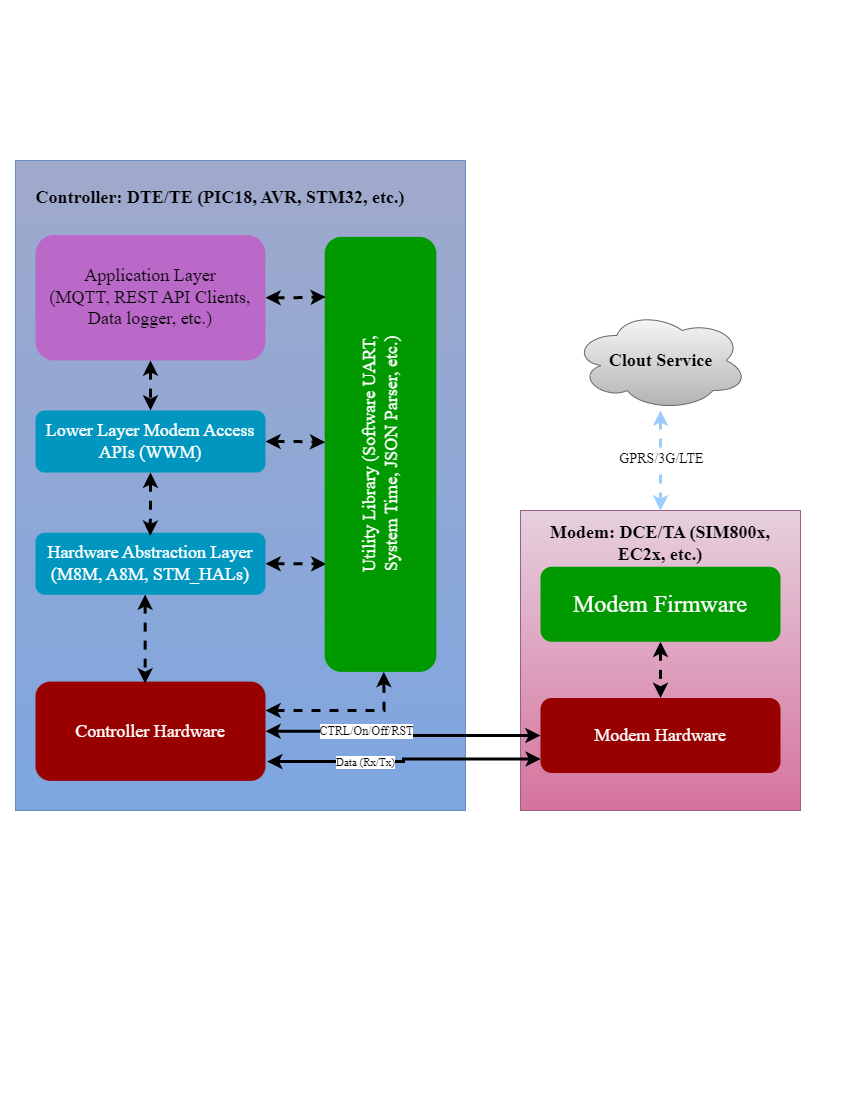 This API has also been tested with the demo Data Logger application, using a SIM800L modem and the STM32F407-DISC1 board. Following is a simplified diagram of it's operation.