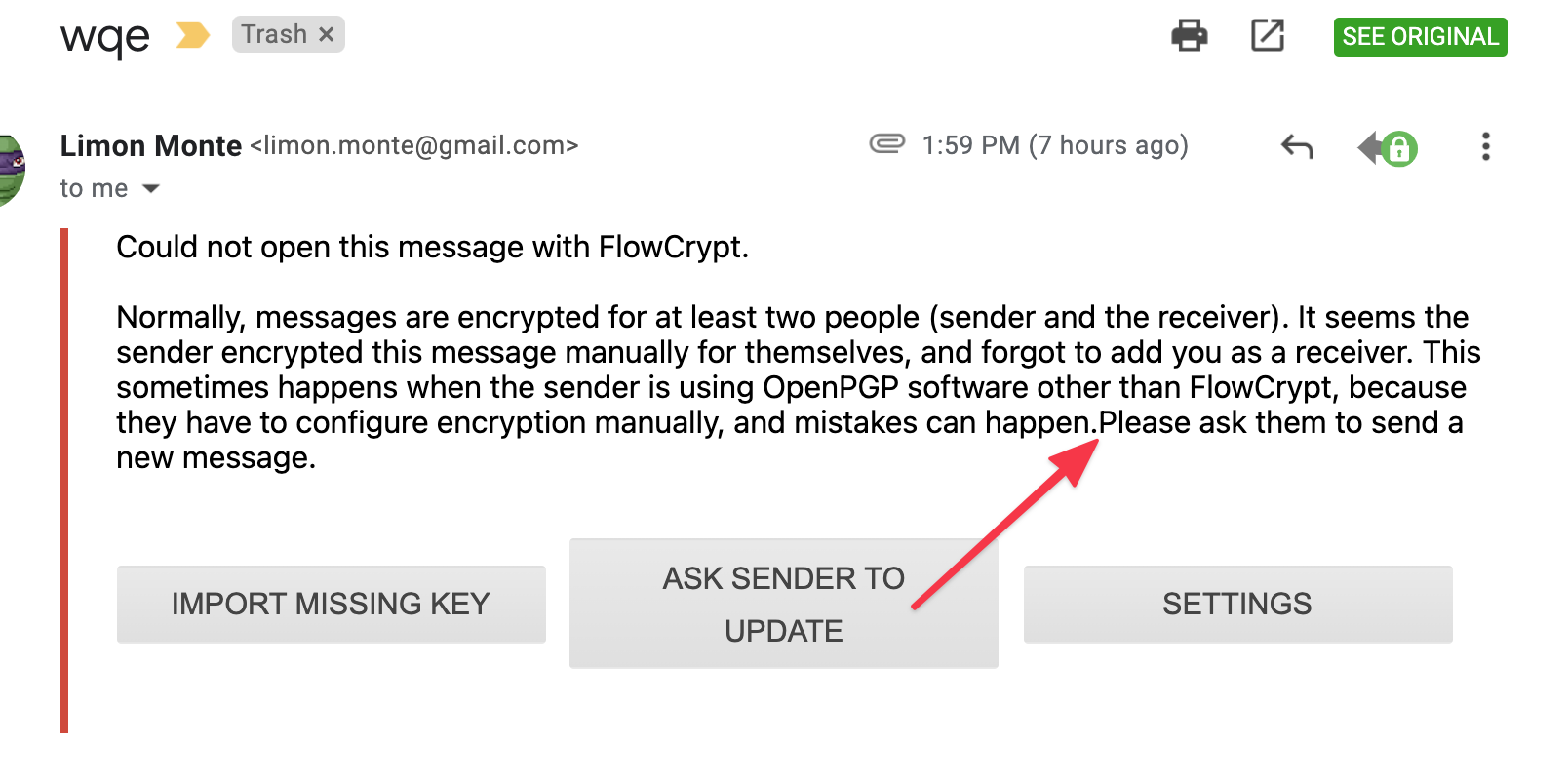 singleSender: 'Normally, messages are encrypted for at least two people (sender and the receiver). It seems the sender encrypted this message manually for themselves, and forgot to add you as a receiver. This sometimes happens when the sender is using OpenPGP software other than FlowCrypt, because they have to configure encryption manually, and mistakes can happen. ', |