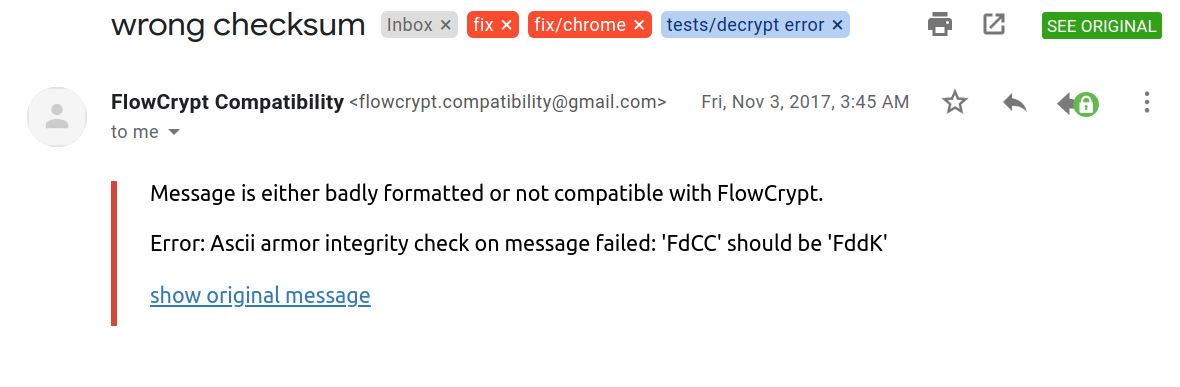 In other cases we can leave the error message as it was implemented before: as we don't have message text, we don't need badges, do we? All signature badges are implemented given the decryption succeeds. if decryption returns "security hazard", then "not signed" badge is shown. |