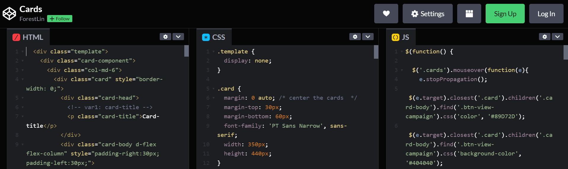 Cards Website Demo https://forestlin2020.github.io/Cards/ Adobe XD mockup https://xd.adobe.com/view/d5ba3afd-9c27-4fa1-8788-b40912a74a6b-80e9/ CodePen Source Code https://codepen.io/forestlin2020/pen/ExoJEwz