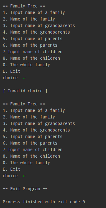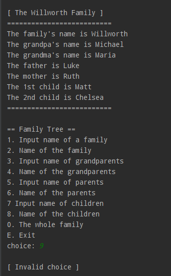 PythonMultiLevelInheritance2 Simple Inut Family-Tree Information objective: create and call multiple inherited classes Example Output: