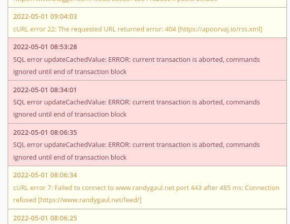FreshRSS[22]: [ishan] [Sun, 01 May 2022 10:02:04 +0530] [error] --- SQL error updateCachedValue: ERROR: current transaction is aborted, commands ignored until end of transaction block
