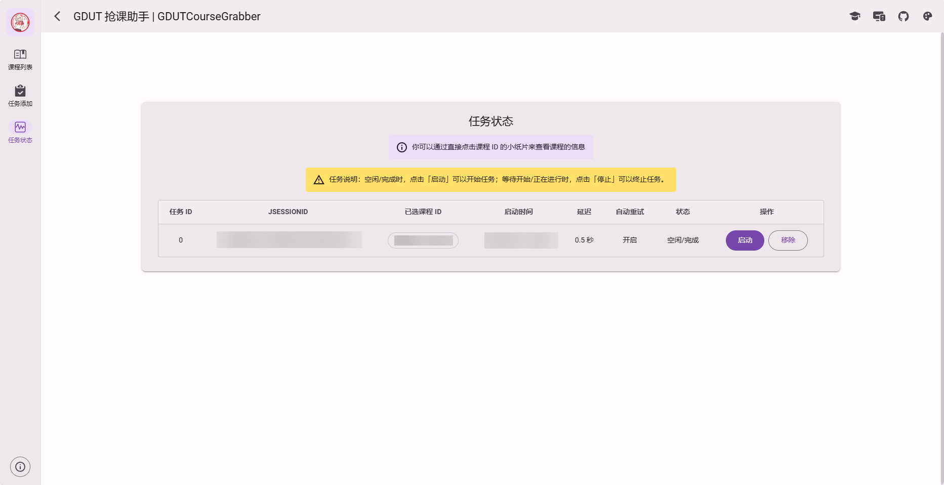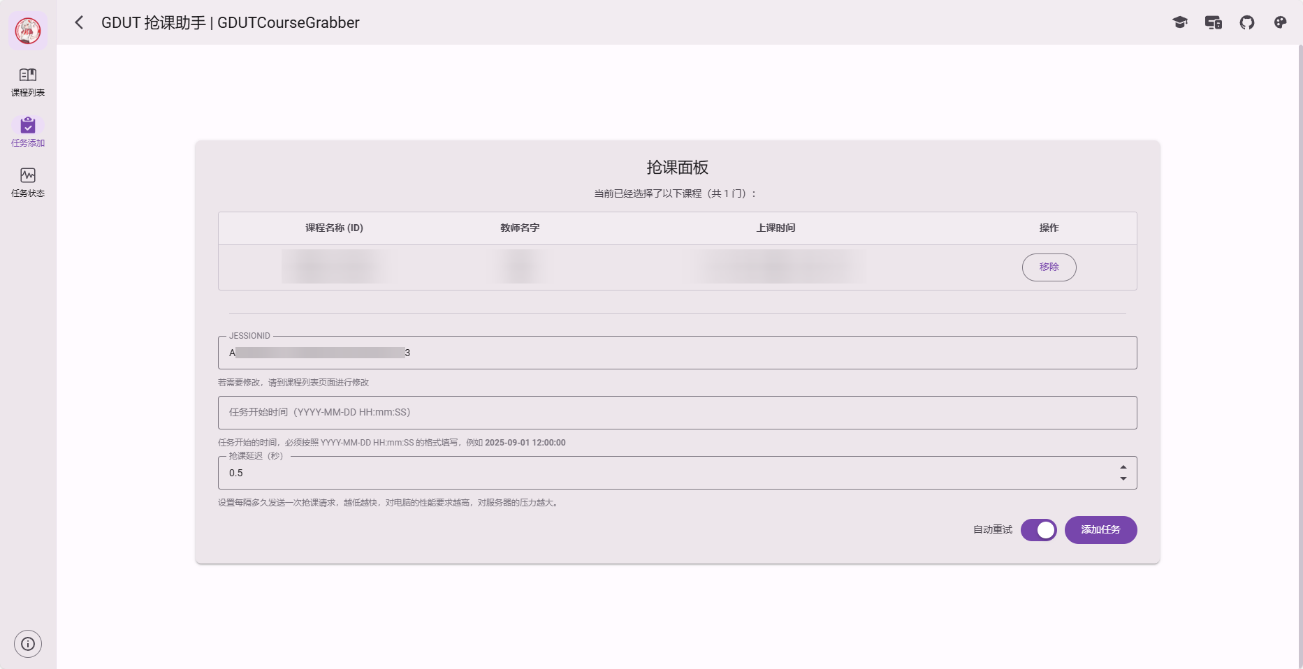 在此处会显示你已经添加的课程列表,你可以在这里进行移除;确认选择的课程与 JSESSIONID 是正确的后,修改「任务开始时间」和「抢课延迟」