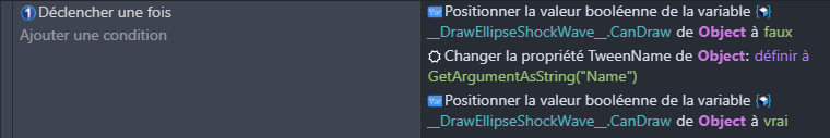 In fact the variable stop the animation ( DrawEllipseShockWave.CanDraw = false ) of the object to apply the modification which we make in the sheet of events just after its creation before restarting the animation ( DrawEllipseShockWave.CanDraw = true ) it is what happens in the project example in the second group of sheet of event (it stop applies the modification of value and restarts the animation for each event) |
