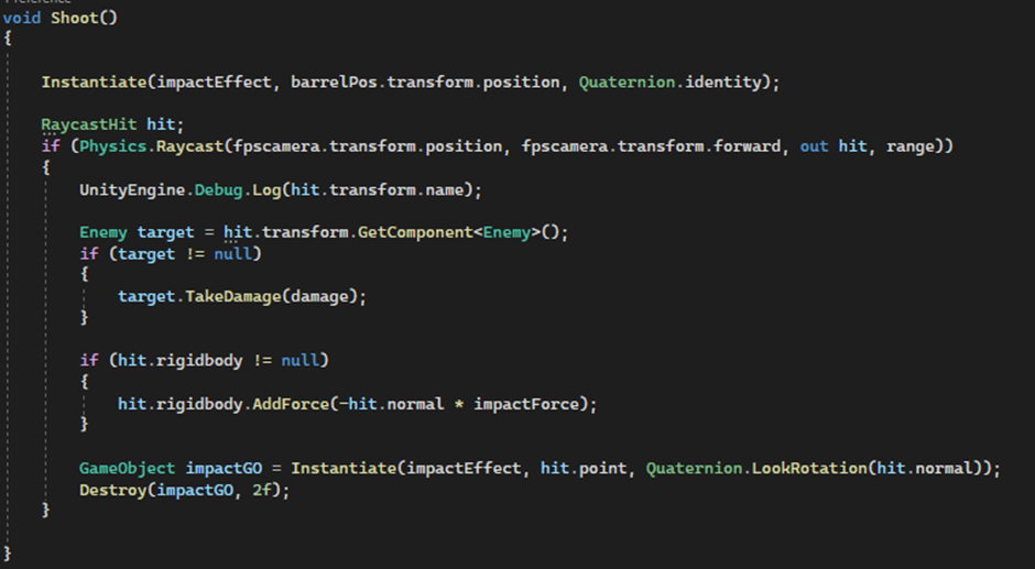 We used Raycasthit class and calculated if we hit something when we shoot. We raycast from our FPS camera position in the forward direction. If we hit an Enemy – we will activate his takeDamage function. We also will Instantiate Impact effect on the hit position and muzzle flash at the gun barrel.