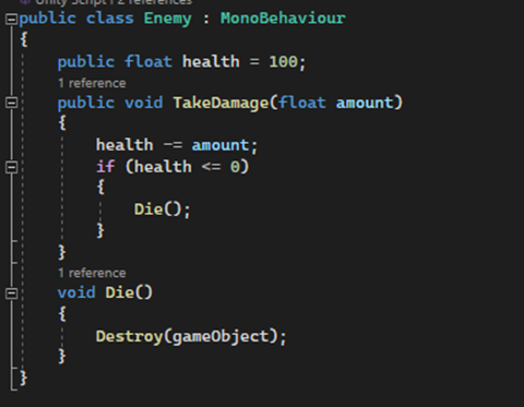 Each enemy have health and public takeDamage() function that will be called when we hit him with the gun shoot, the function will decrease his health. When health is less then 0 – we will destroy the enemy object by calling Die() function.