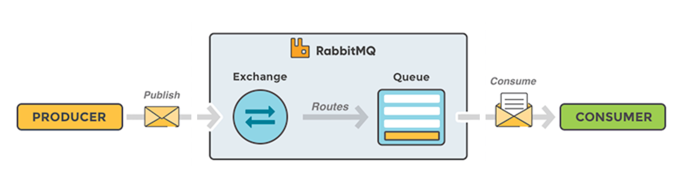 - Fila (Queue): Também conhecida como fila, é responsável por entregar as mensagens aos consumidores ou armazená-las antes do processamento.