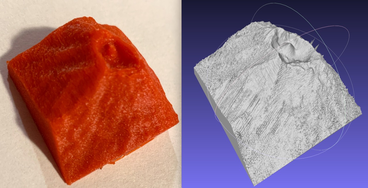 STL is the format used by 3-D printers. This PR simply implements a new -T[b] option in grd2xyz that represents the grid in the form of a triangularized 3-D body by enclosing the surface triangulation with the four sides and base to make an enclosed volume. We can either write an ASCII or binary representation, as explained in the STL documentation. With the help of a UH colleague who has a 3D printer I have implemented, debugged, and tested this option and I think it is stable enough to be included in 6.3. Below is an example of a quick-and-dirty 3D print from my colleague using the GMT-produced STL which apparently worked much better than Matlab (the full-resolution version will take 48 hours to print, apparently). I have added this figure to the grd2xyz documentation: