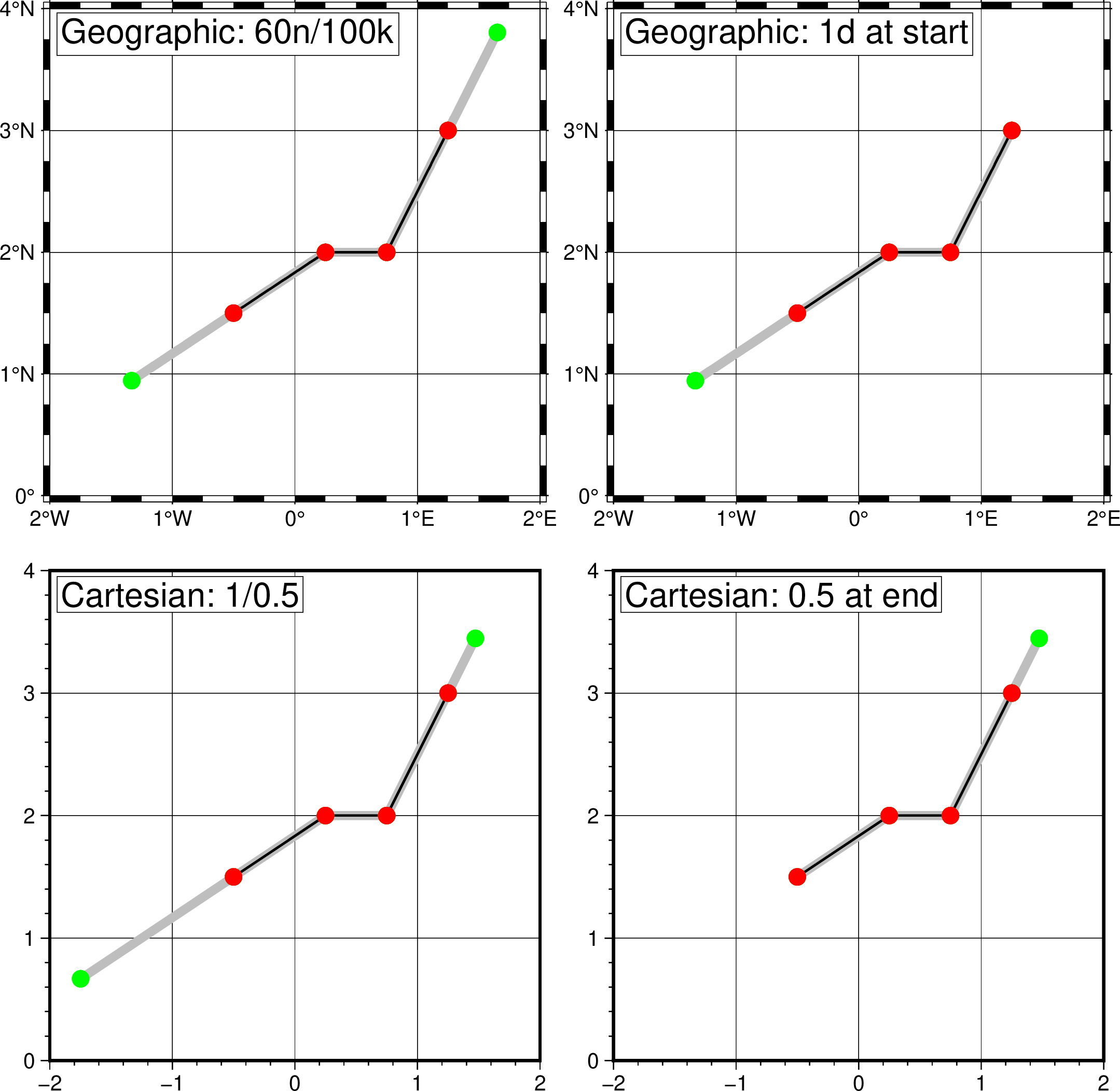 I have fixed the dumb copy/paste comment and added explanation to the docs that the geographic calculations are spherical. I could code up Karney 2012 but this is already in proj and/or GDAL so we could add this as needed. It makes no difference for short extensions but will show up for long extensions. As for the azimuthal options. If these are sensible and useful they can be added. I did think of azimuths but best fit on a sphere is what fitcircle does for instance, but it does not report azimuths so we would have to add some coding here. And again this is pseudo-elliptical (authalic parameters for a sphere). For discussion, I can imagine the new modifier +a[azim[/azim2]] where +a (no args) means determine azimuth from best fit great/small circle (or least-squares line for Cartesian), +aazim means use that azimuth at either end (of the ends selected if +f|l is used) and +aazimf/asiml for separate azimuths. Note that for long lines and lines close to poles the single azimuth option would give very different results at either end. Might it be useful to have modifiers for adding a deviation to the selected azimuth? E.g., +a+d10/5 would add 10 degrees to the azimuth at start and 5 at the end? |