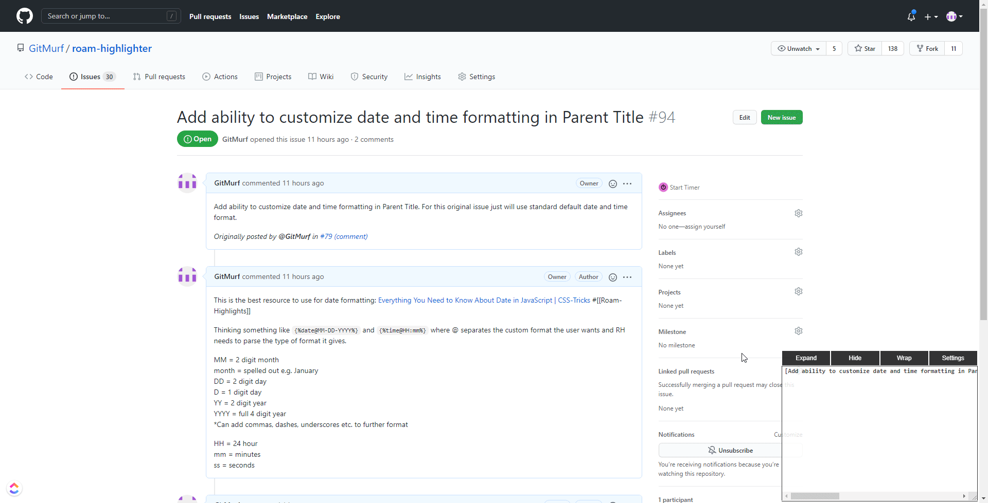 Allow the user to save different custom options to select with drop down. Can chrome save arrays in the browser settings? Then they could quickly switch between different options they've saved in the past. And create one for like "article to read" with some tags. Another like "todo item" adding a checkbox at front. Another "video to watch" with its special tags. If can save array then can have unlimited. Otherwise could just give them 5 placeholder options maybe to save. Then to delete they need to select one and click a delete icon button and get a Js alert popup asking to confirm. Maybe require in format placeholders to be inside {% %} like: {%title%}. This allows to use Roam placeholders like {{TODO}} and not get confused with placeholders for roam-highlighter. |