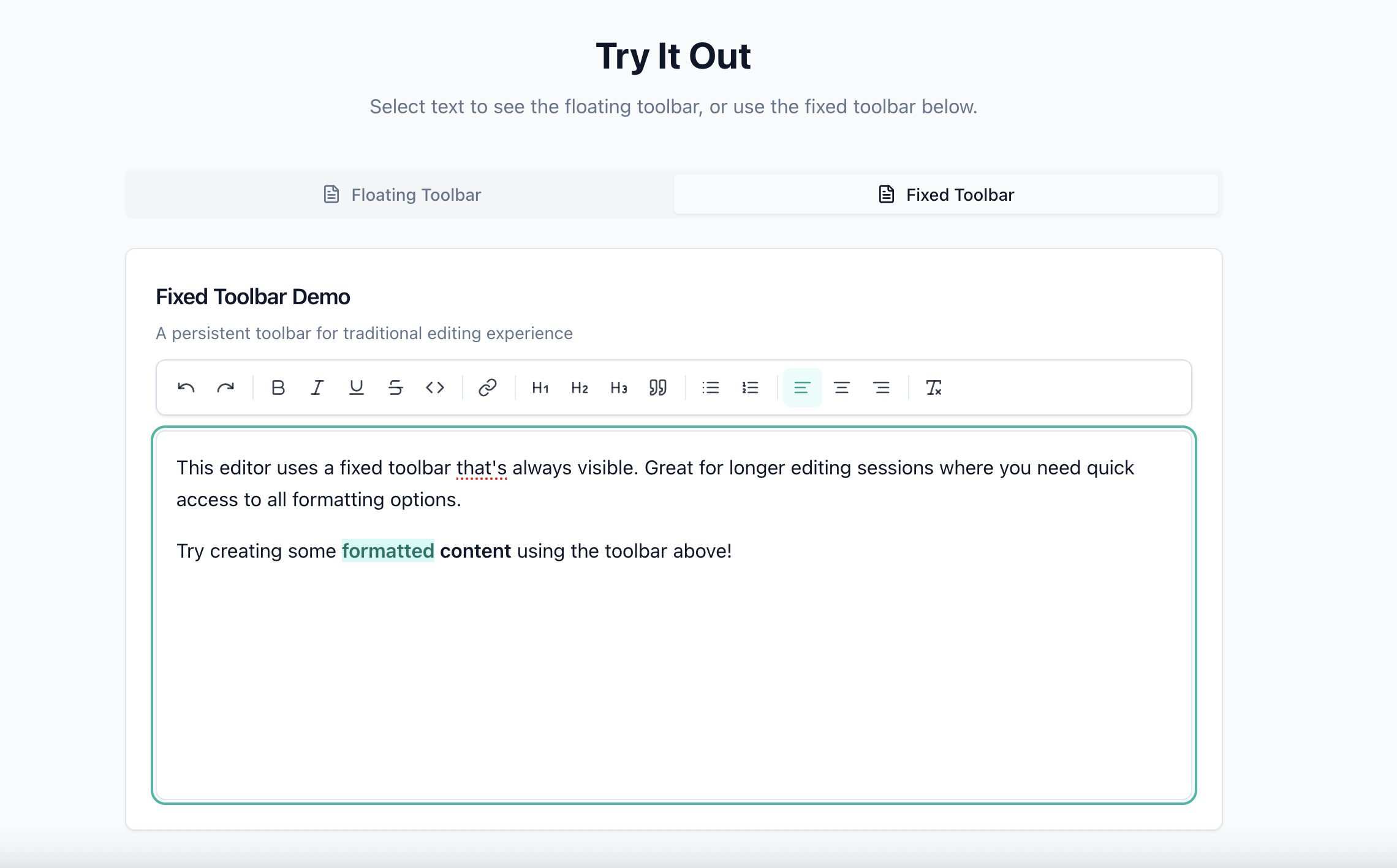 | API | Inline Toolbar | Fixed Editor |