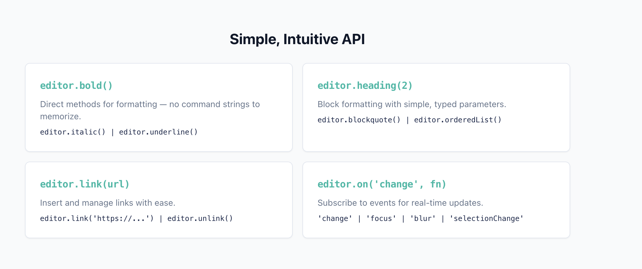 editor.bold()/editor.italic()/editor.underline()editor.heading(1 | 2 | 3)/editor.paragraph()/editor.blockquote()editor.orderedList()/editor.unorderedList()editor.link(url)/editor.unlink()editor.setFontSize(size)/editor.setFontFamily(family)editor.setColor(color)/editor.setBackgroundColor(color)editor.getHTML()/editor.getText()/editor.isEmpty()