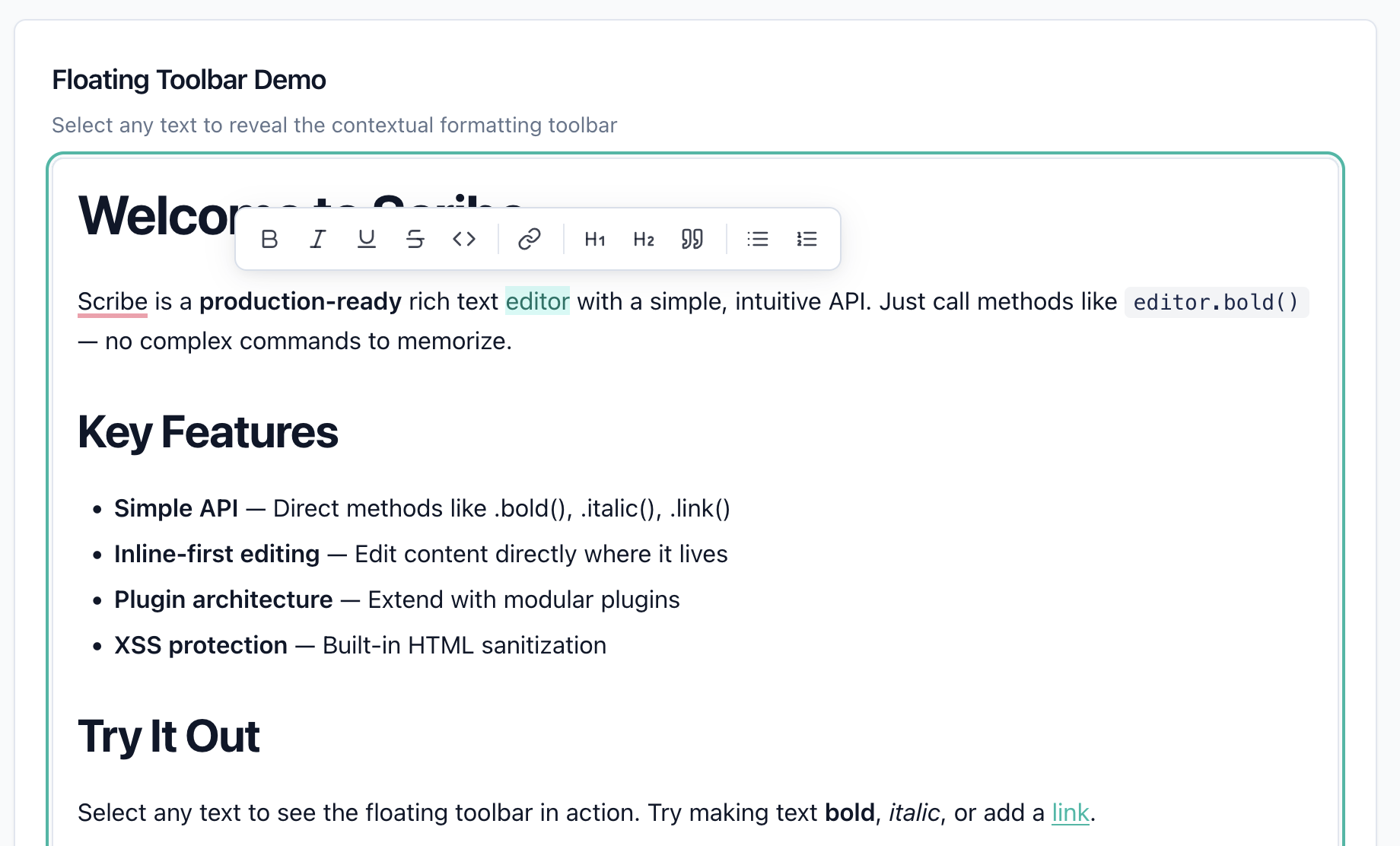 Lightweight rich-text editor core with a modern demo UI, fixed toolbar workflow, and a minimal API.