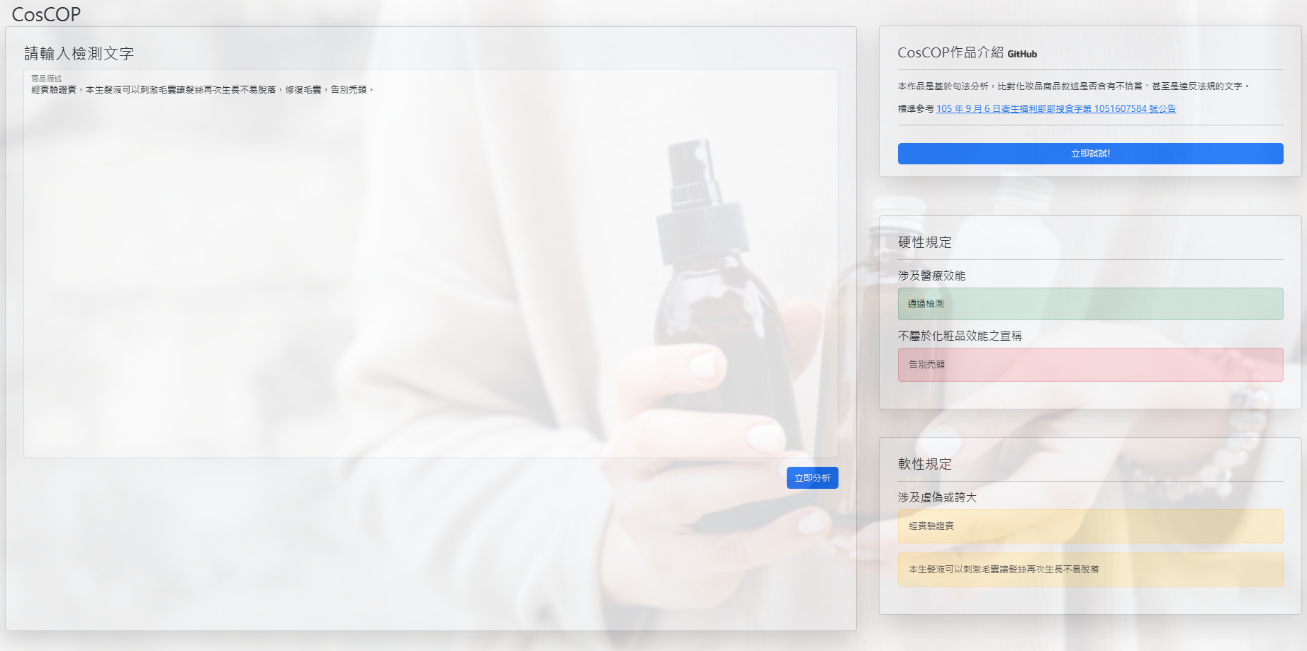 CosCOP Cosmetic COP 一個非依靠關鍵字驅動的違法化妝品產品敘述偵測工具 使用方式 上傳 /Loki/ref 中所有檔案至 https://api.droidtown.co/loki/ 在 / 加入檔案 account.info 並填入 { "username": "", "loki_key":""} 執行 python ./flask/app.py 啟動介面 執行畫面
