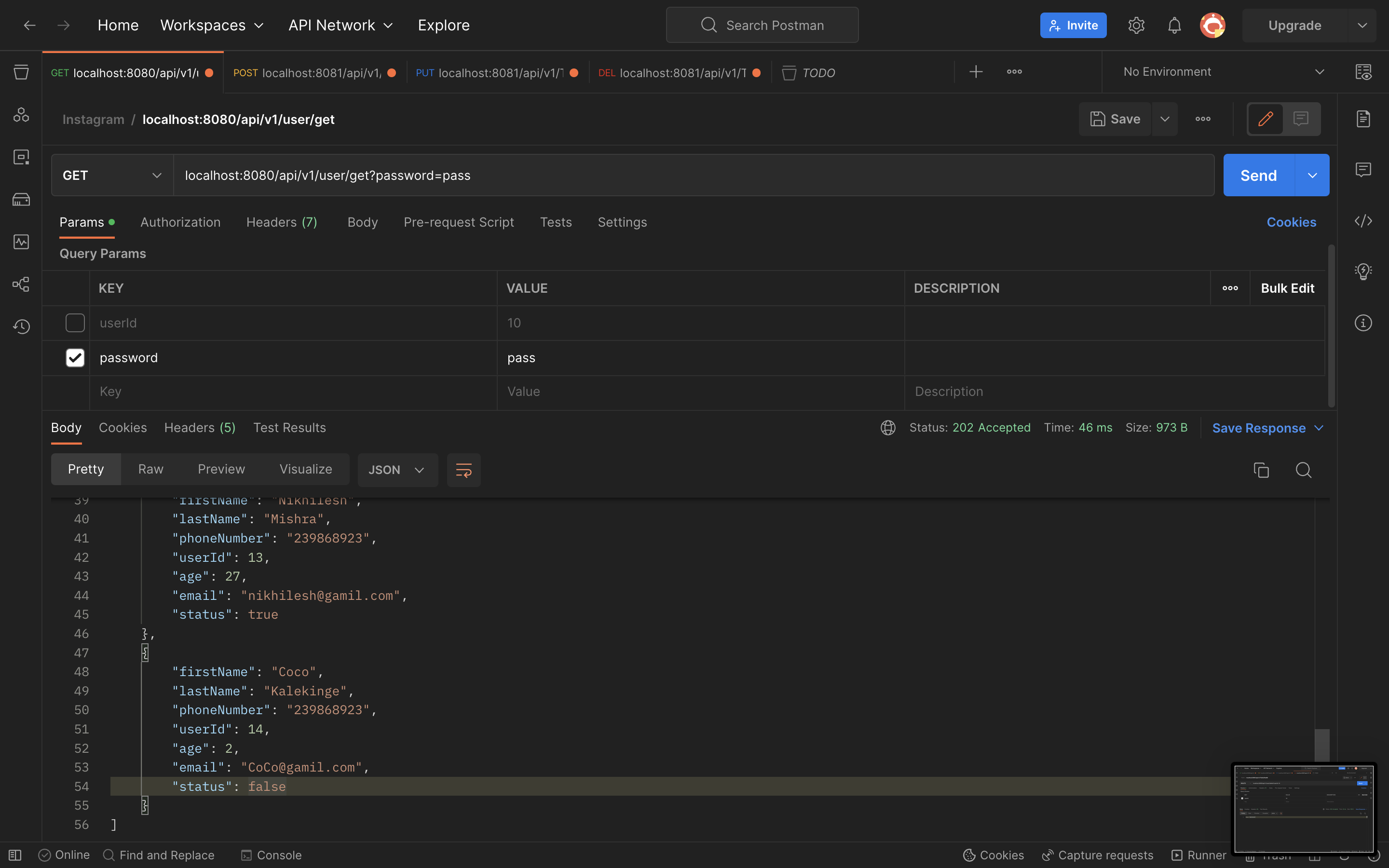 ➡️ : FindAll Active Users : localhost:8080/api/v1/user/get?password=pass