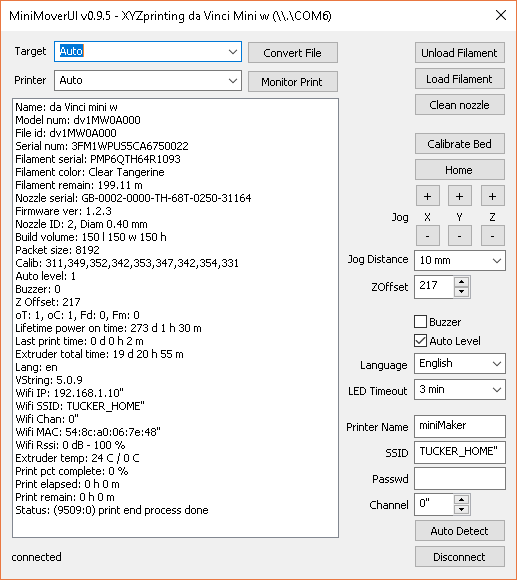 This is a project that lets you send GCode to an XYZ da Vinci prniter. It will also convert from a .3w file to .gcode and back, and can monitor and setup the printer as well. This works with newer printers that implement the version 3 serial protocol. These include the Nano, Mini W, miniMaker and Jr. line of printers among others.