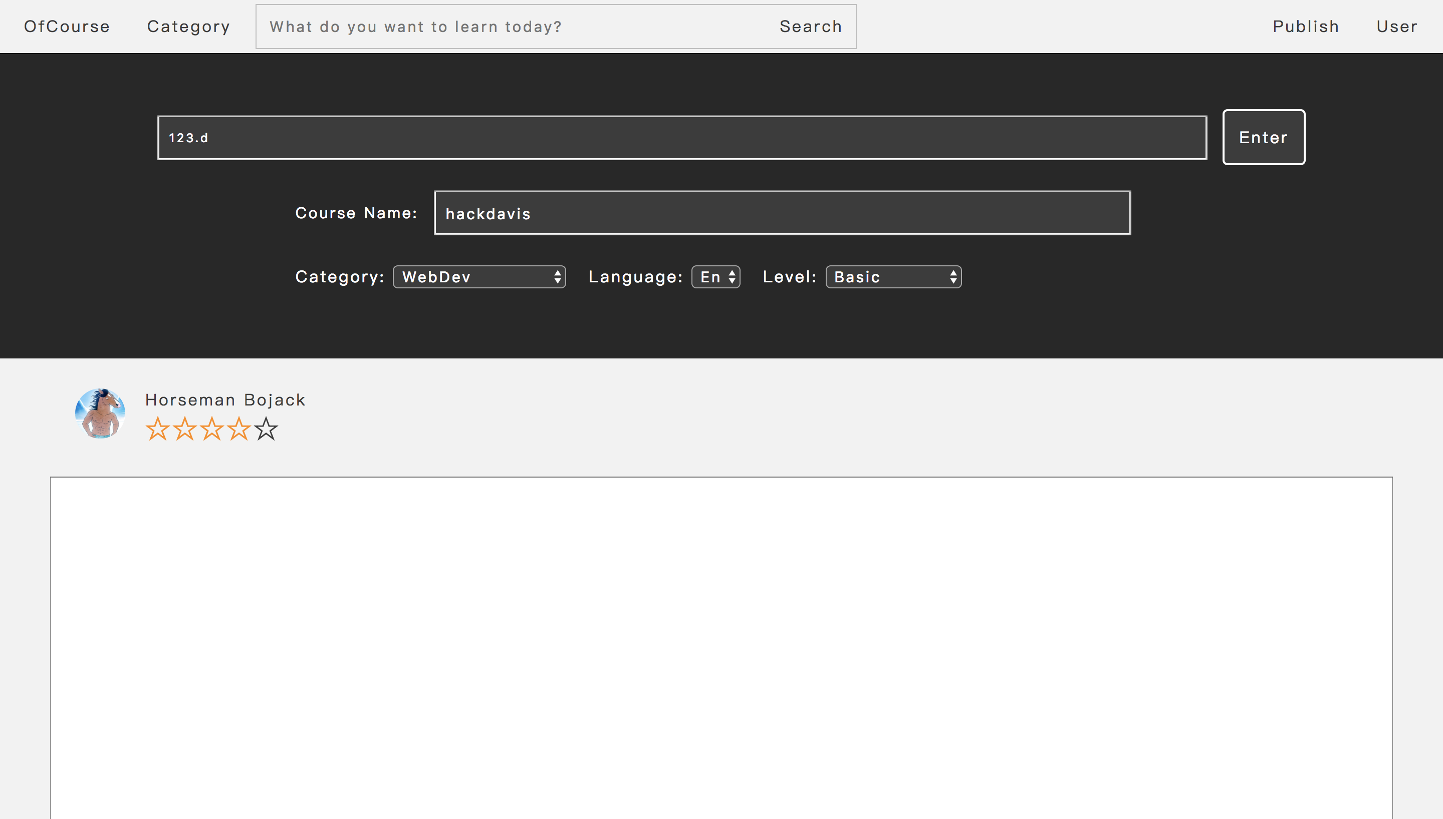 This page is for user writing a whole new comment. The top input bar is for inserting url of the online course. If the course is in our database, our system will fill all information of the course automatically. If the course isn't in our database, user should fill all information manually.
