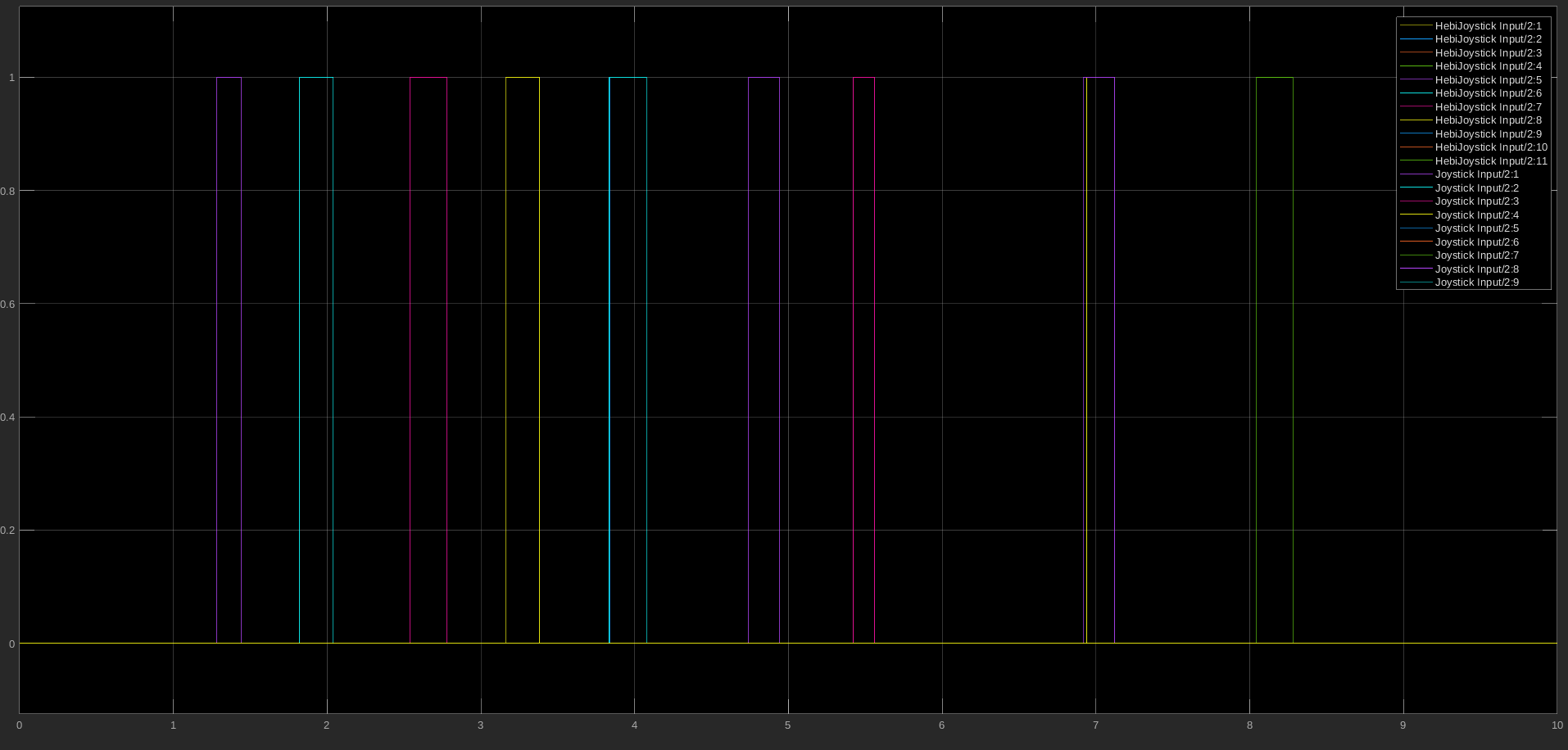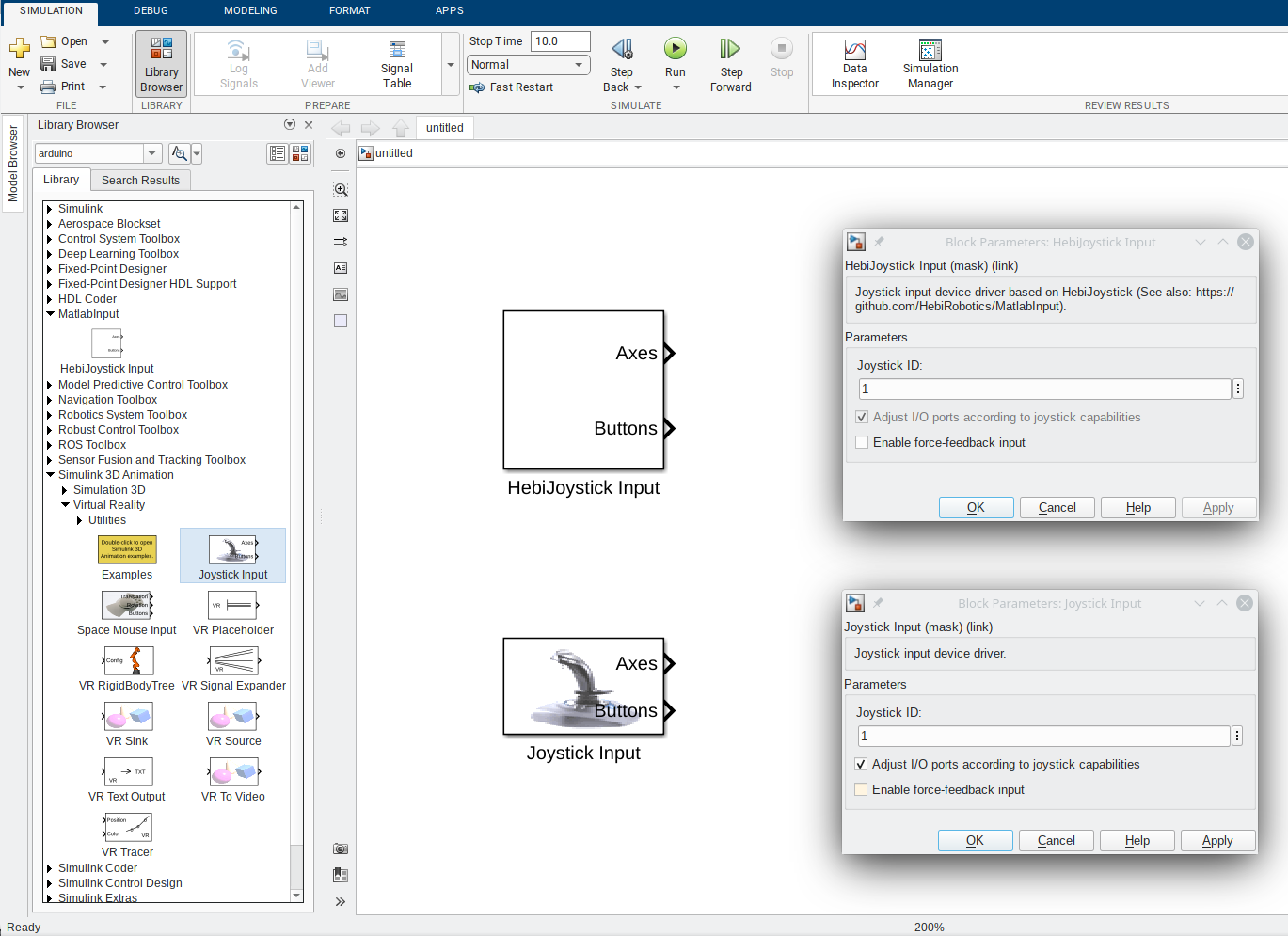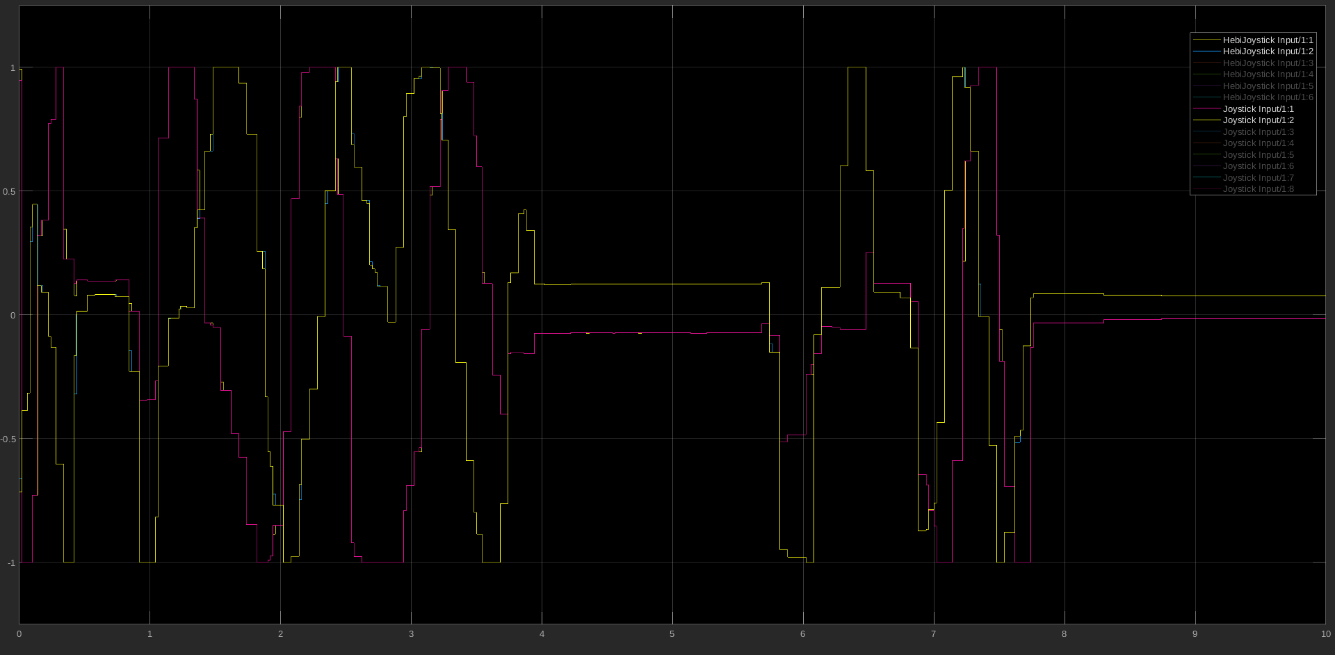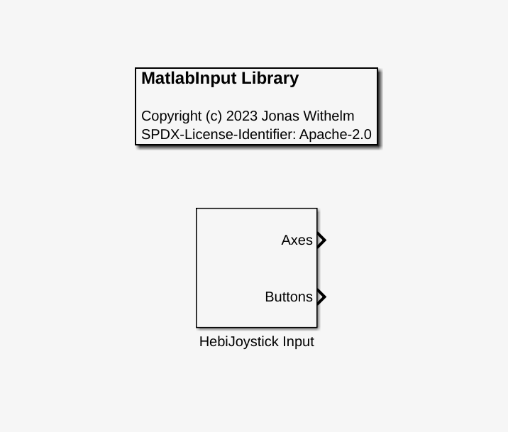 Thank you for HebiJoystick! 😄 I created the library (matlabinput_lib.slx) with Matlab/Simulink R2018b, but I also tested it with Matlab/Simulink R2022b (a test license in which I can use the original Joystick Input block from the Simulink 3D Animation toolbox). The implementation is based on a Level-2 MATLAB S-Function (hebijoyinput.m) which uses HebiJoystick. If you directly open the library file (matlabinput_lib.slx) it looks like this: As you can see here, the outputs and configuration masks of both blocks are identical: The force-feedback function is implemented and working (at least for an XBox controller) but interestingly force-feedback does not seem to work with the original Joystick Input block as you can see here: Also here are two side-by-side comparisons of the Axes and Buttons Outputs of both blocks: I configured HebiJoystick Input to use a discrete sample rate of 50 Hz to prevent Simulink from calling the instance of HebiJoystick to often. I think this is also a different behavior from the original Joystick Input block (but also very easy to change in hebijoyinput.m). As a last point, I changed the target structure of the project to achieve a better separation between the Matlab and Simulink files (If you'd like, you can view it here: https://github.com/jwithelm/MatlabInput/releases) |