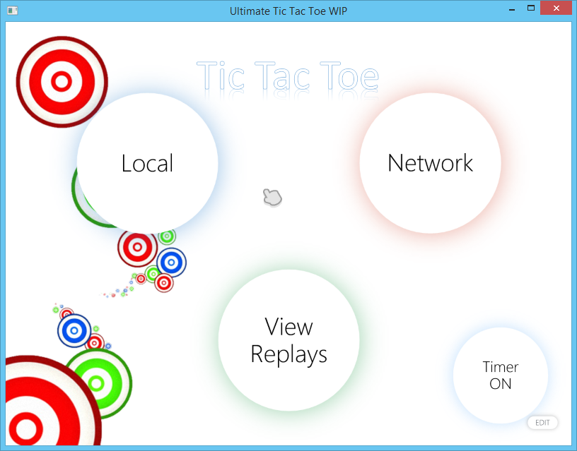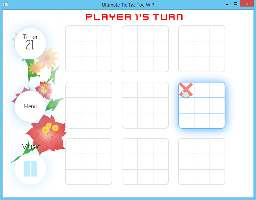 #Ultimate Tic Tac Toe #Features Multiplayer! Which includes Functional in-game instant messaging(IM) system Disconnection handling Replay system to record games both offline and online Timer #Screenshots ###Main Menu ###Gameplay Screens ####Offline ####Lan Multiplayer