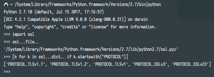 /usr/bin/python on El Capitan and on the latest beta of MacOS Sierra do not support TLS 1.1+. Python 2.7.9+ is not the mechanism by which you determine security support. (Another counterpoint: RHEL/CentOS 7 ship Python 2.7.5 but have backported This demonstrates that El Capitan's Python does not support TLS 1.1+: